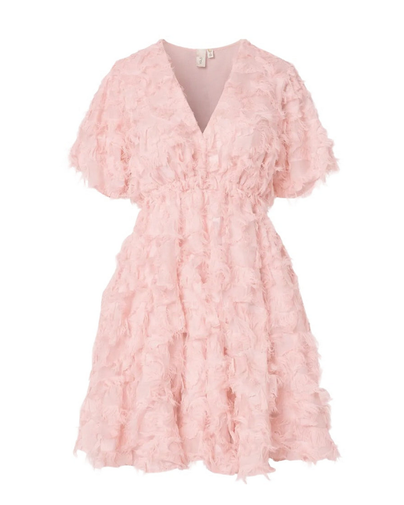 Y.A.S - Upea vaaleanpunaisen värinen mekko hapsulookissa. Mekossa on normaali istuvuus ja v-pääntie edessä. Vyötäröllä kuminauha antamassa sekä istuvuutta, että mukavuutta olemiseen. A-linjainen helma, johon antaa volyymiä vuorikankaassa oleva tylliosa.