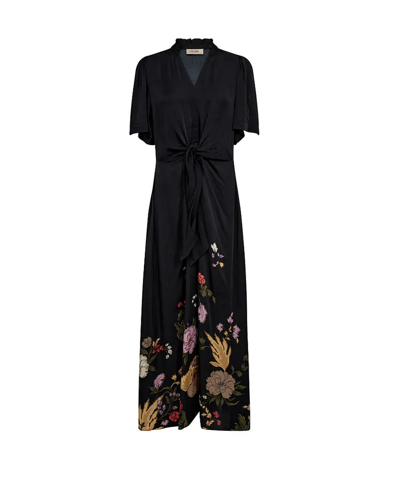 Mos Mosh - Upea maximitan satiinimekko mustassa värissä, jossa helmassa kukkakuosia. V-päänteinen mekkomalli, jossa lyhyet väljät hihat. Olkapäillä kevyttä volanttia. Vyötäröllä yksityiskohtana kiinteä solmuke. A-linjainen helmaosa. Rinnanympärys koossa M: n. 104cm.