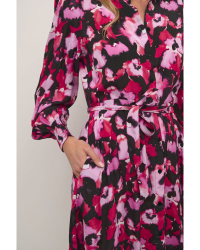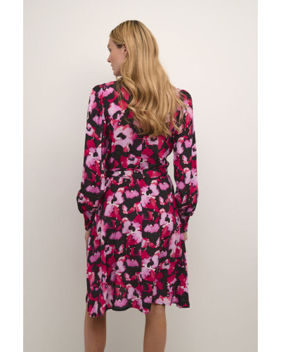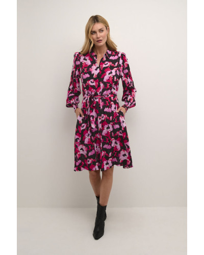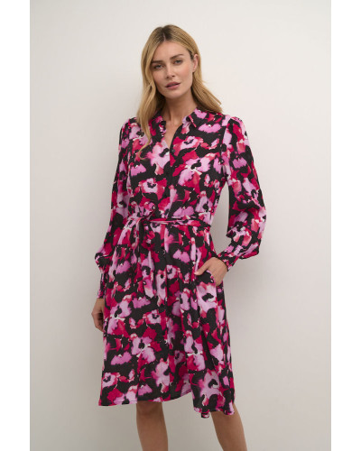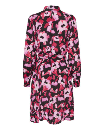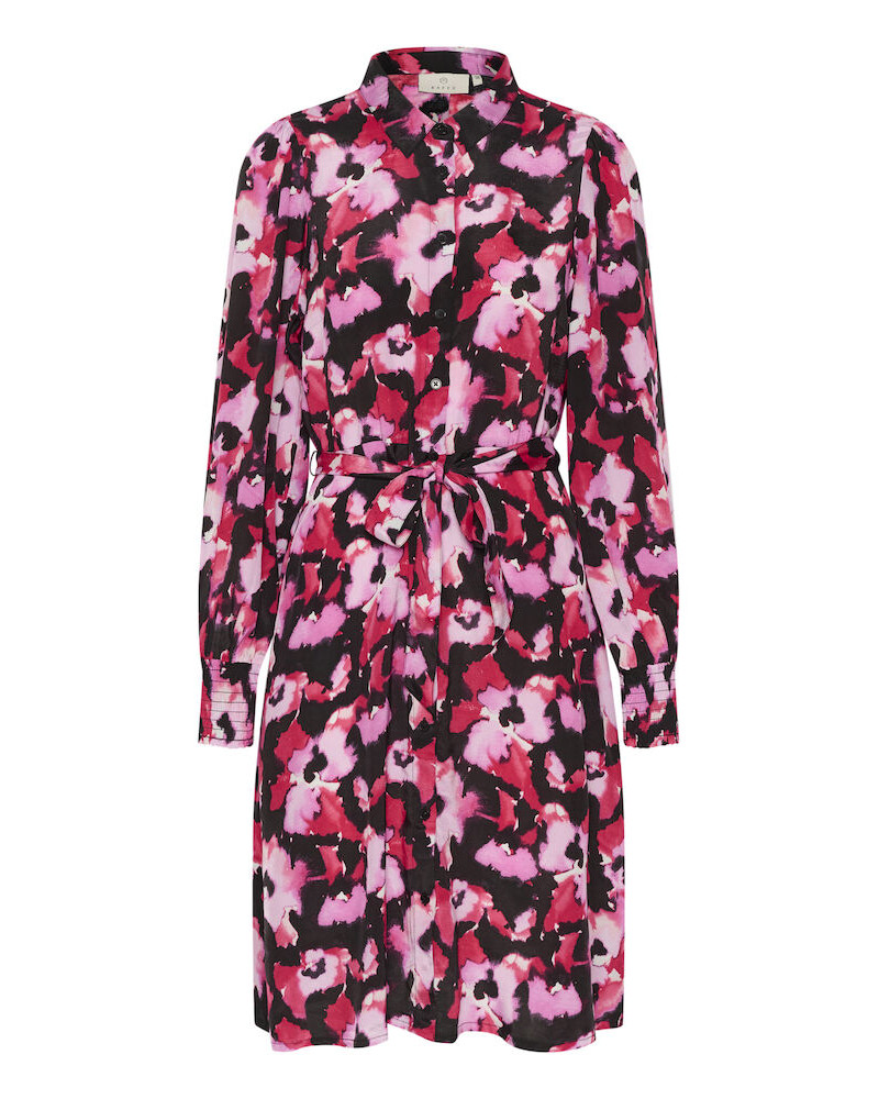 Kaffe - Hauska pinkki-kuositeltu viskoosimekko, jossa täyspitkät hihat. Hihojen suissa smokkirypytykset. Mekossa on kaulukset ja napitus koko matkalla edessä. Mukana irtokangasvyö. Mallissa on poikkileikkaus vyötäröllä ja helmaosa a-linjainen. Taskut sivusaumoissa.