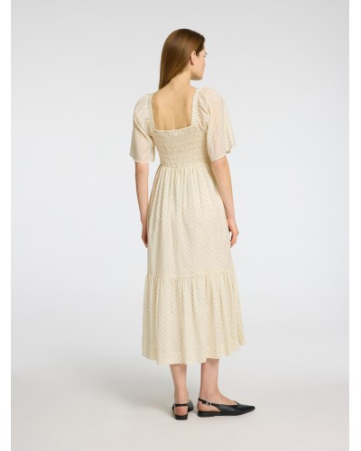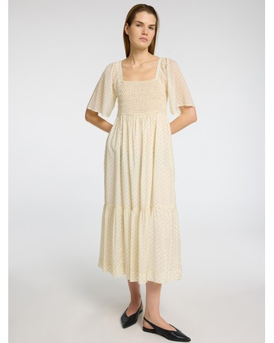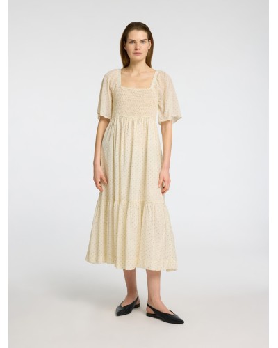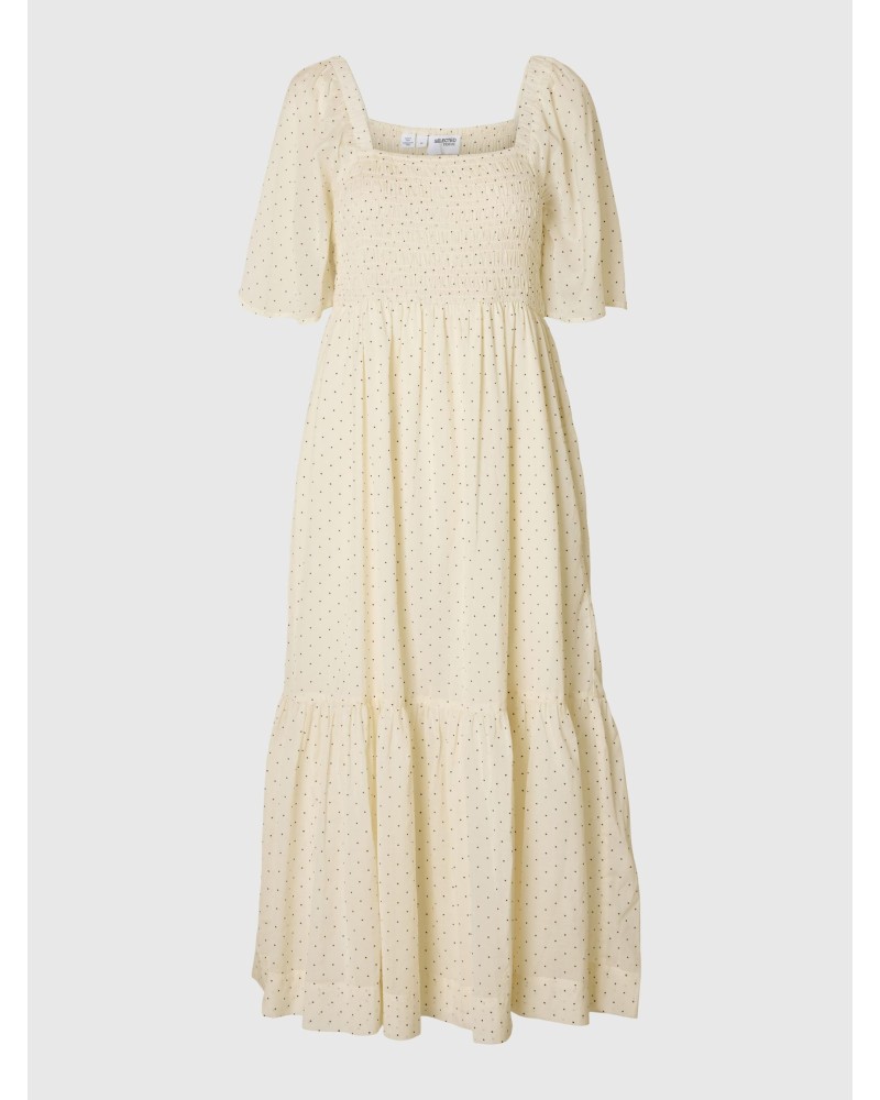 Selected Femme - Kaunis puuvillasekotteinen maxi-mitan mekko. Laatikkomallinen pääntie ja lyhyet hihat. Rintaosuus smokkirypytyksen ansiosta istuva. Väljä mitoitus, voit valita ainakin yhden koon pienemmän mitä normaalisti käytät. Väritys: luonnonvalkoinen, jossa mustia pilkkuja. Malli on 178cm pitkä ja käyttää kokoa 36.