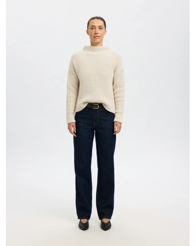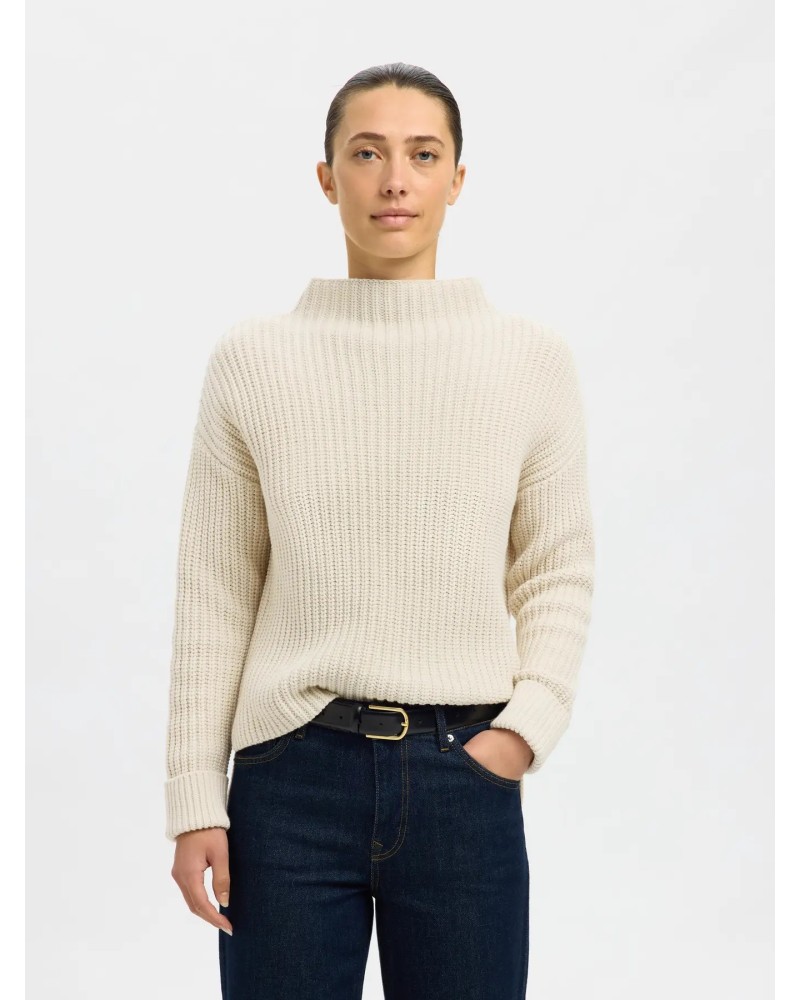 Selected Femmen - neulospusero jossa pieni pystykaulus. Pudotetut olkapäät ja käännetyt hihat. Neuleessa pienet halkiot sivuillla. Väri Birch. Katso mitat alta.
