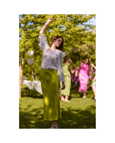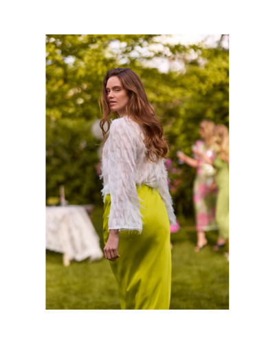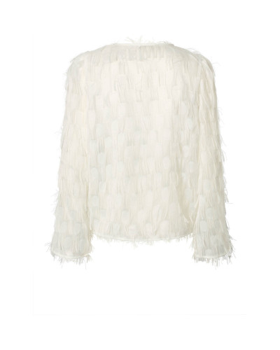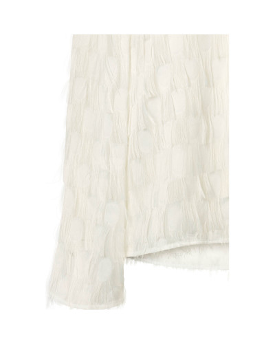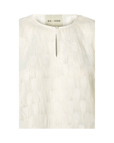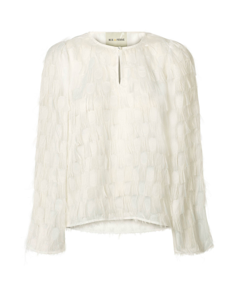 Rue de Femme - Vega on kevyt ja ilmava paita, jossa on koristeellista tekstuuria ja pyöreä pääntie. Hienovaraiset hapsut lisäävät naisellisuutta ja luovat elegantin liikkuvuuden tunteen. Yhdistä hameen kanssa saadaksesi elegantin asun tai korkeavyötäröisten housujen kanssa saadaksesi modernin kontrastin pehmeyden ja rakenteen välillä.