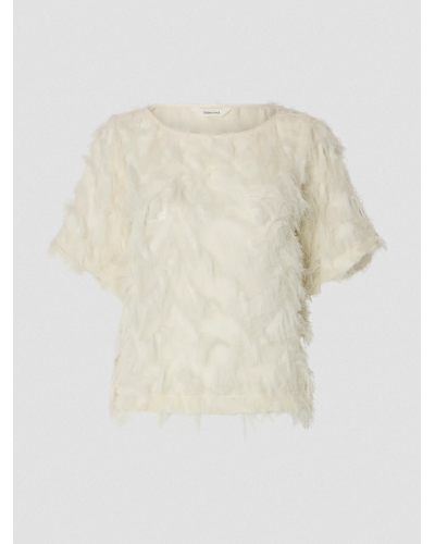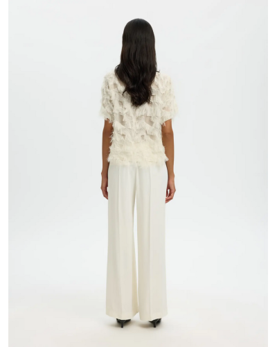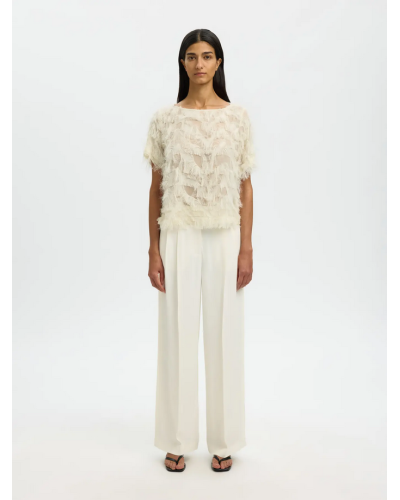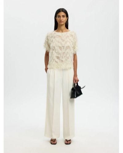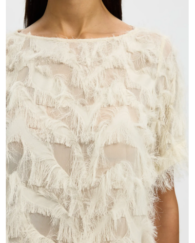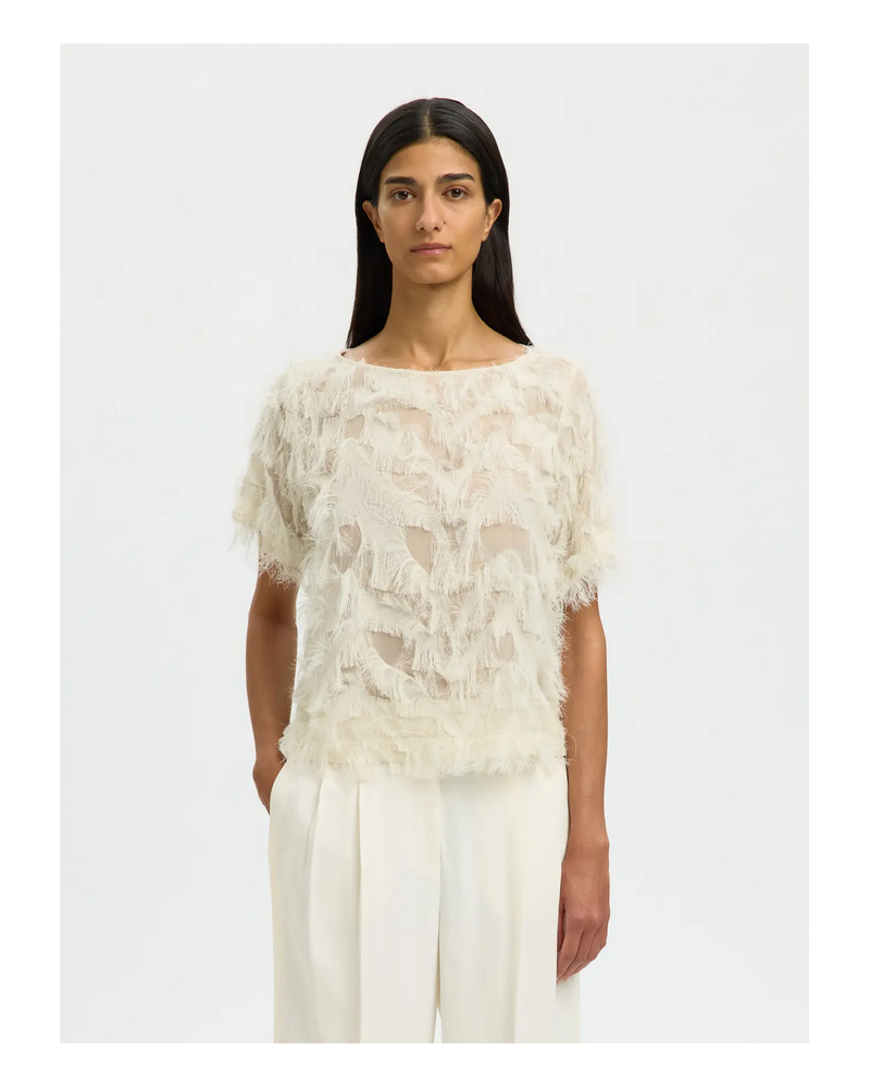 Selected Femme - Ihanainen hapsutoppi, jossa vene-pääntie ja pienet hihat. Yhdistä rennosti farkkujen ja tennareiden kera tai juhlaan räätälöidyn alaosan ja korkokenkien kanssa. Väljä istuvuus. Rinnanympärys koossa 36: 104cm ja niska-helma pituus. 53cm.