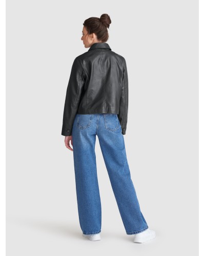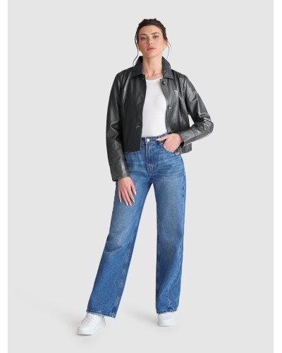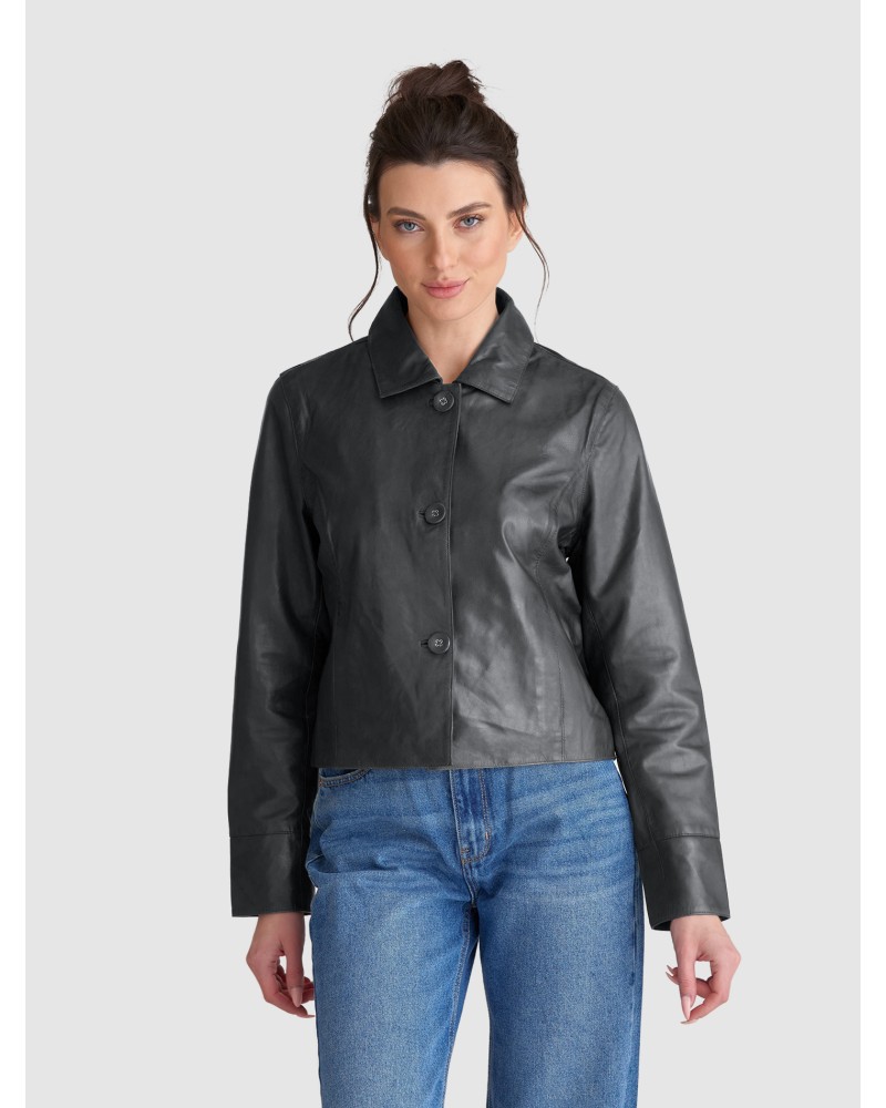 Saki Sweden - Rento mutta tyylikäs nahkatakki. Yksinkertaiset yksityiskohdat, kuten paidan kaulus ja huomaamattomat vyötärötaskut. Lyhyempi pituus ja napillinen etukiinnitys antavat takille modernin ilmeen. Käytä sitä denim-bleiserin tai naisellisen mekon sijaan. Ihanan pehmeä materiaali. Varmistathan oikean koon saamiseksi mitat alta!